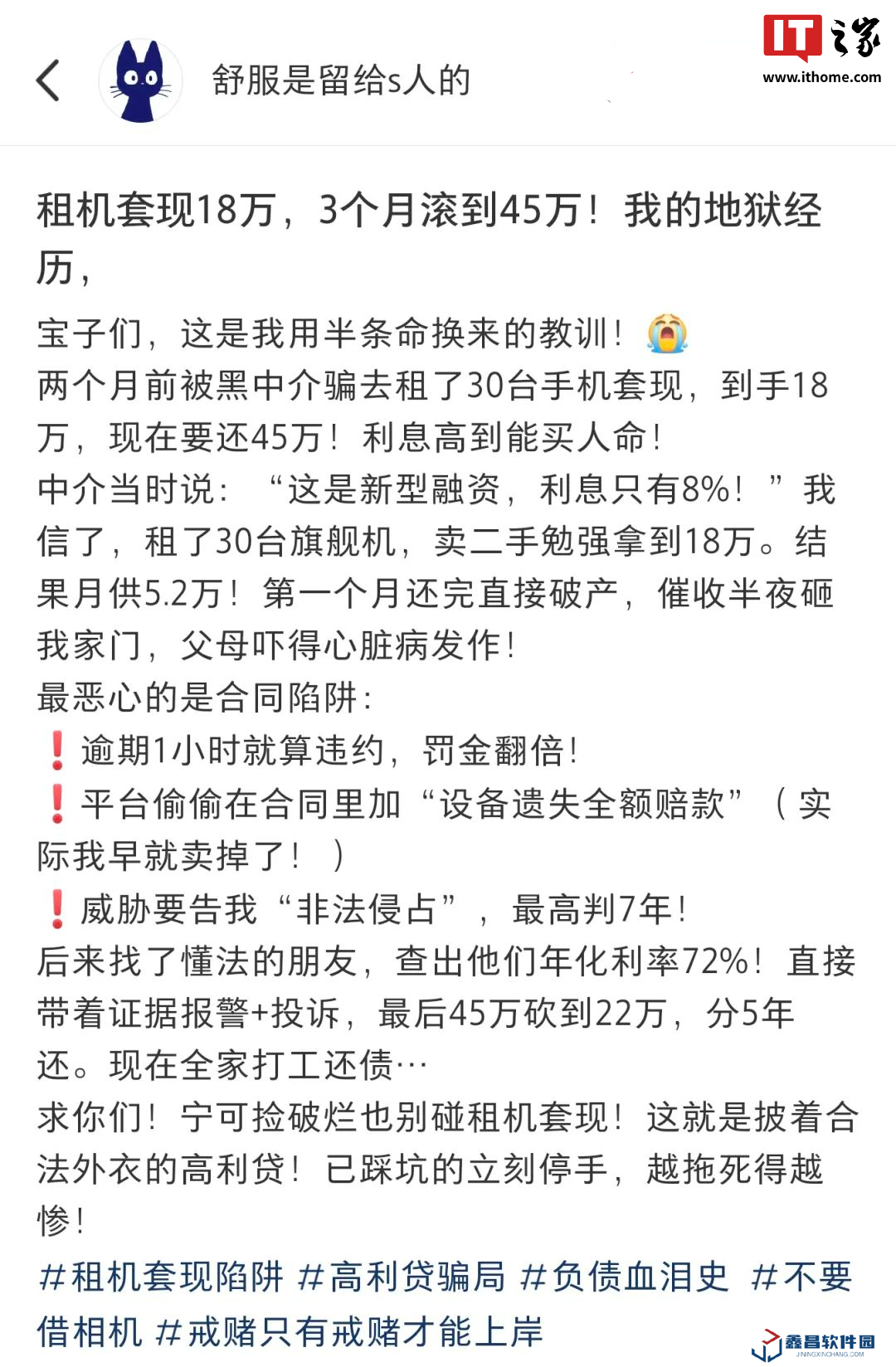 3 月 9 日,有網(wǎng)友在社交平臺發(fā)文分享了自己的租機貸經(jīng)歷,按照該網(wǎng)友的說法,他被黑中介騙去租了 30 臺手機套現(xiàn),到手 18 萬,結(jié)果要還 45 萬。