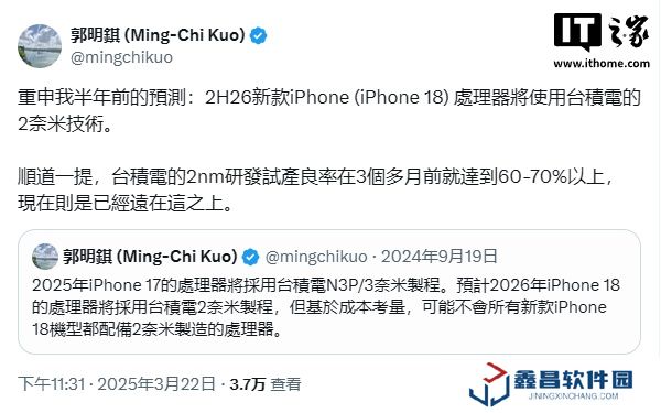 - 郭明錤重申:蘋(píng)果 iPhone 18 系列的 A20 處理器將采用 2 納米工藝