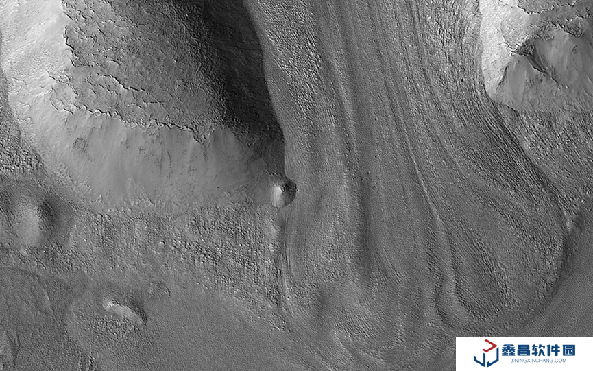 冰川狀地貌 —— 在兩個(gè)山脊間,大量物質(zhì)似乎曾向下流動(dòng),形成冰川狀地貌(Glacier-like features),這暗示火星中緯度地區(qū)過去可能存在冰層堆積。圖片來源:美國(guó)國(guó)家航空航天局 /噴氣推進(jìn)實(shí)驗(yàn)室-加州理工 / 亞利桑那大學(xué)