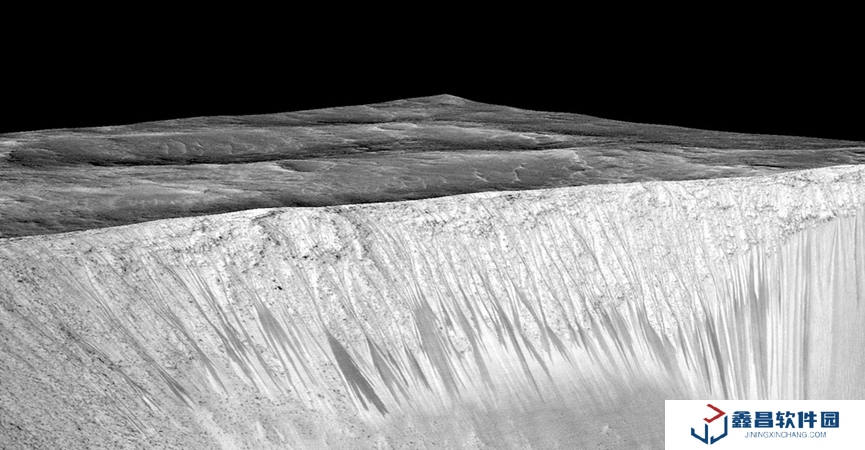 我們還觀測(cè)到被稱為“季節(jié)性斜坡紋線”的地貌,其特征像是沿著斜坡向下延伸的黑色條紋。這些深色條紋會(huì)隨季節(jié)生長(zhǎng)延伸。軌道探測(cè)器拍攝過其生長(zhǎng)前后的變化影像。有一種假設(shè)認(rèn)為,這可能是由快速上升的地下水補(bǔ)給造成的,或者是夏季少量冰融化后潤(rùn)滑了坡面。但其水源成因尚未可知,也可能是干雪崩(dry avalanche)造成的。畢竟火星和其他行星上存在許多地球沒有的地質(zhì)現(xiàn)象。